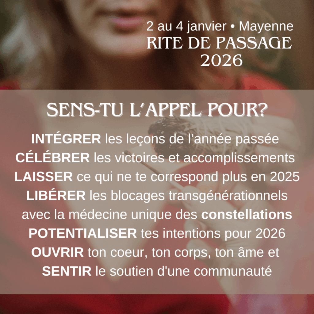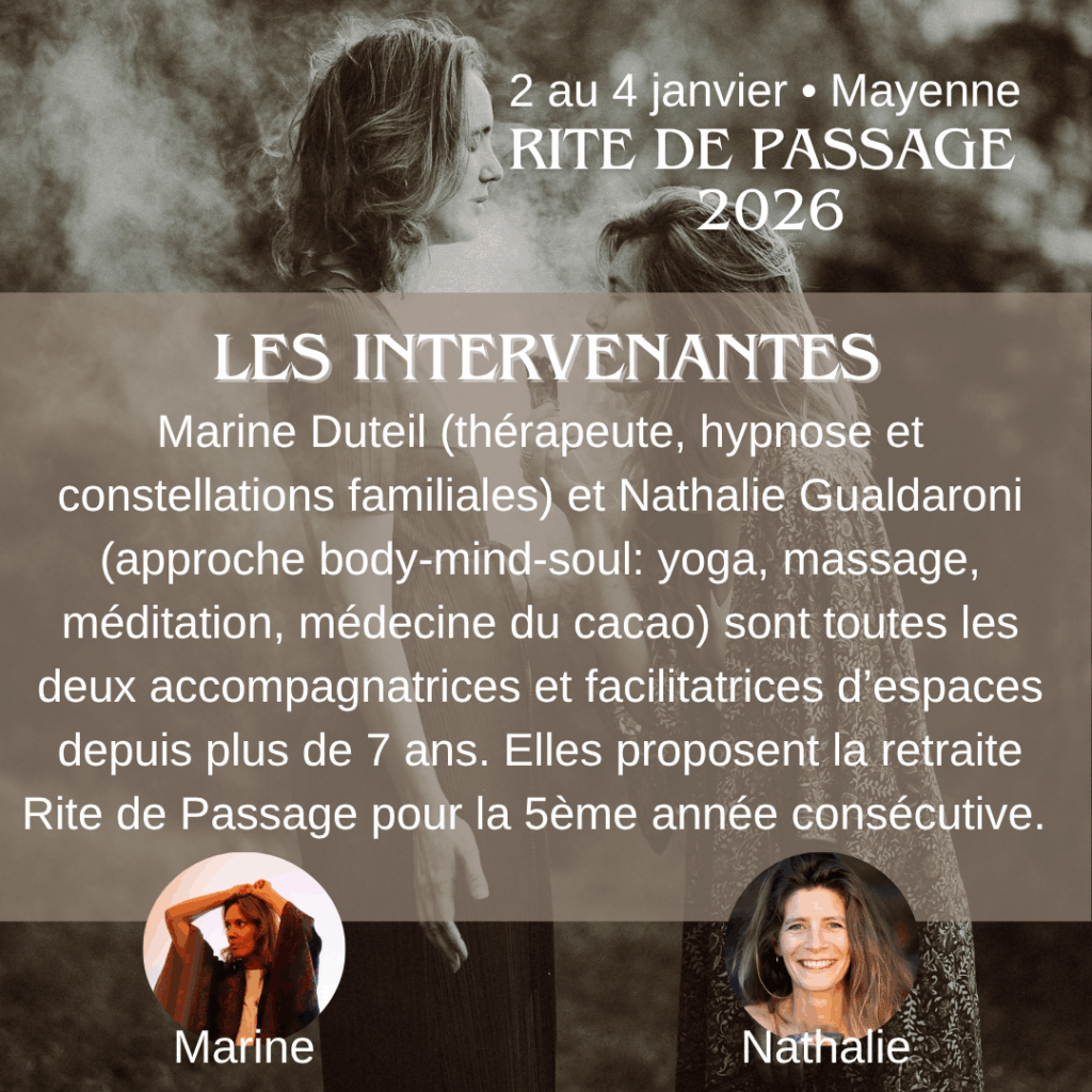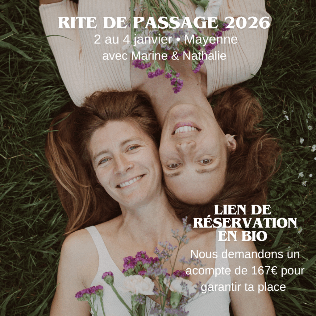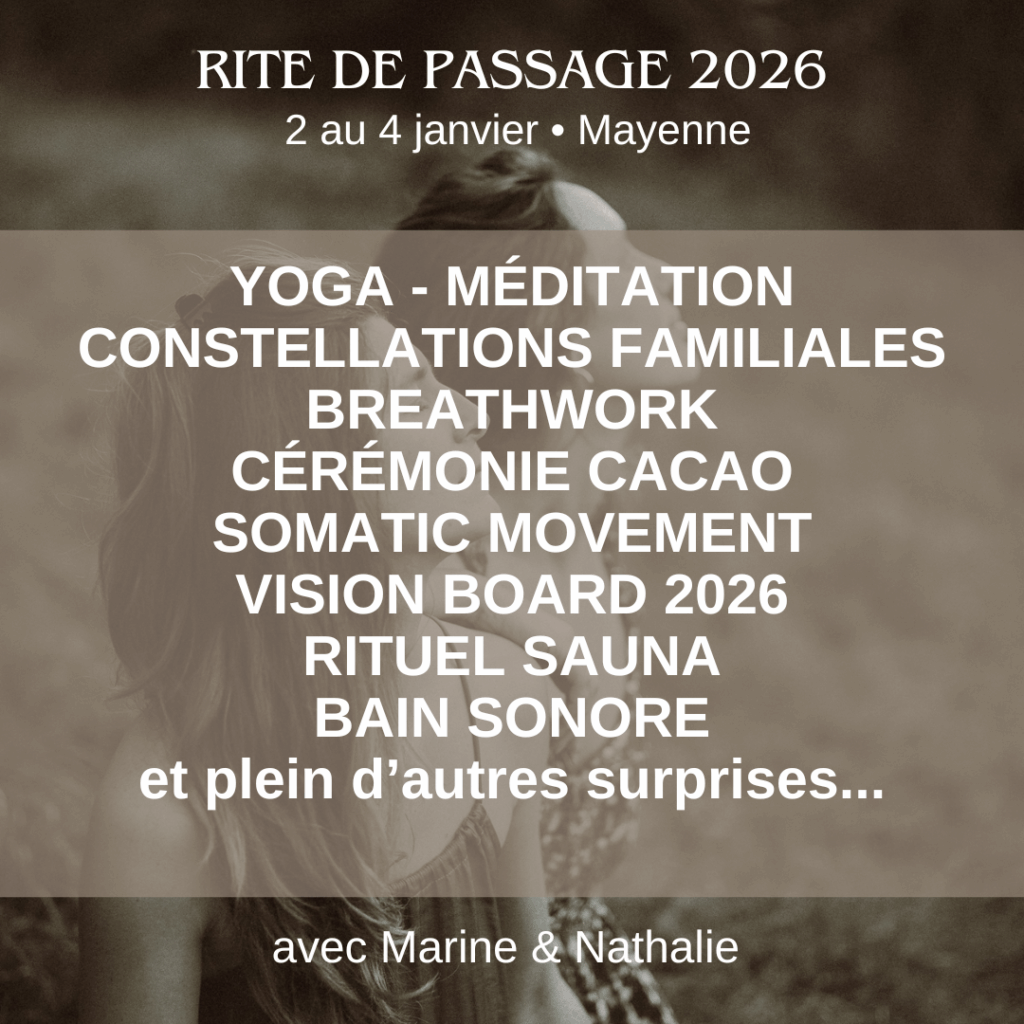 Voici la 5ème édition de cette retraite en co-création avec mon amie Marine Duteil (hypnothérapeute spécialisée en constellations familiales). Nous vous donnons RDV du 2 au 4 janvier 2026 à la ferme de Peuton (en Mayenne, entre Paris et Rennes) pour ces 3 jours hors du temps. Nous explorerons ensemble les thèmes qui ont marqué votre année 2025, pour apprendre à les intégrer et à garder les enseignements utiles pour avancer au mieux en 2026. Nos pratiques seront multiples avec: du yoga, de la méditation, des cercles de partages, une cérémonie cacao, de la danse libre, du breathwork, un atelier constellations, des rituels, un atelier vision board. Nous vous embarquons dans une aventure inédite pour envisager votre année 2026 plus sereinement, avec une direction claire et des intentions concrètes. Toutes les informations se trouvent sur la page de réservation ci-dessous.